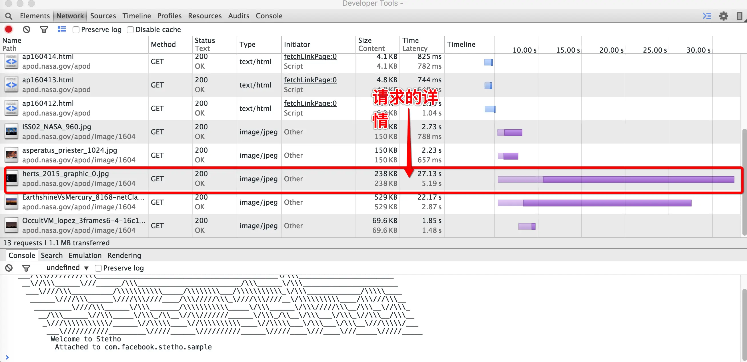 - 第二个tab叫做”Network”,是用来做网络监控的,基本上覆盖了Chrome开发者工具中”Network inspection”的所有功能点,包括下载图片的预览,JSON数据查看,网络请求内容和返回内容