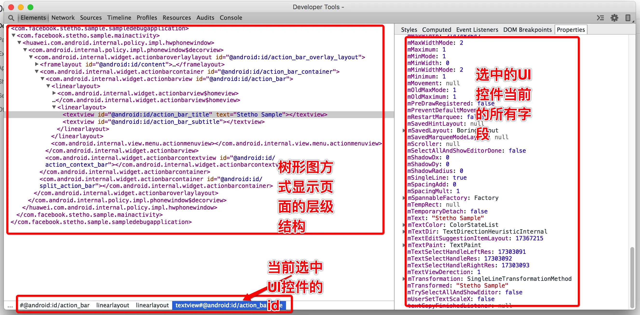 - 首先看功能导航条的第一个tab,叫做”Elements”,工作区中的内容是不是很熟悉,Hierarchy Viewer,很像吧,点击具体的xml节点,可以看到连接的手机上对应的UI控件高亮显示了,这个可以像Hierarchy Viewer那样分析APP页面的嵌套层级