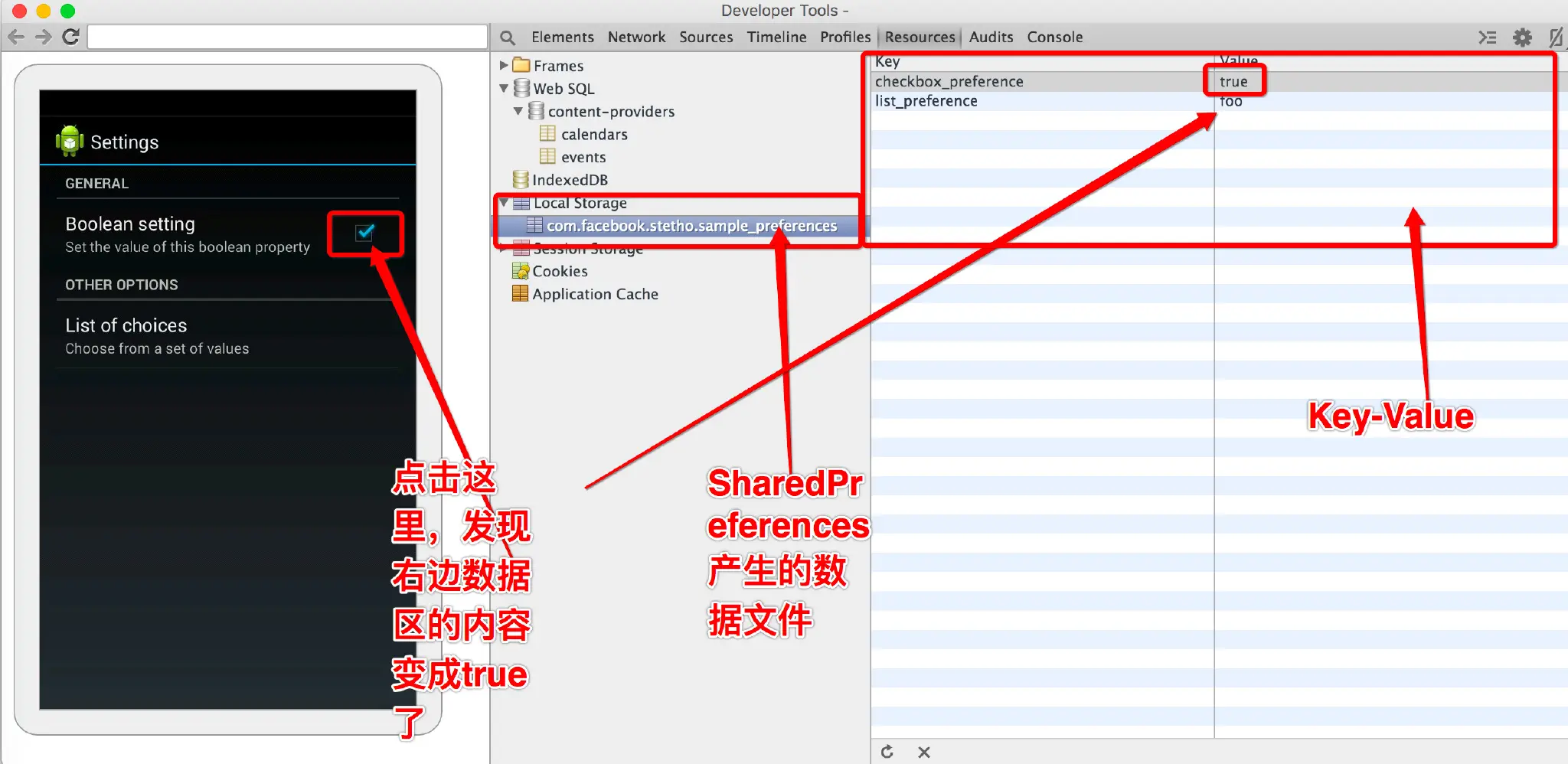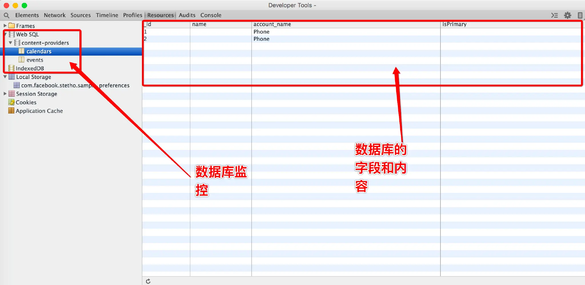 直接跳过"Timeline", "Profiles"看第六个tab,"Resources",顾名思义,这里应该就是查看APP内部产生数据的地方啦,目前支持的数据有两种,一种是数据库(ContentProvider和Sql的方式)的数据,另一种是SharedPreferences数据