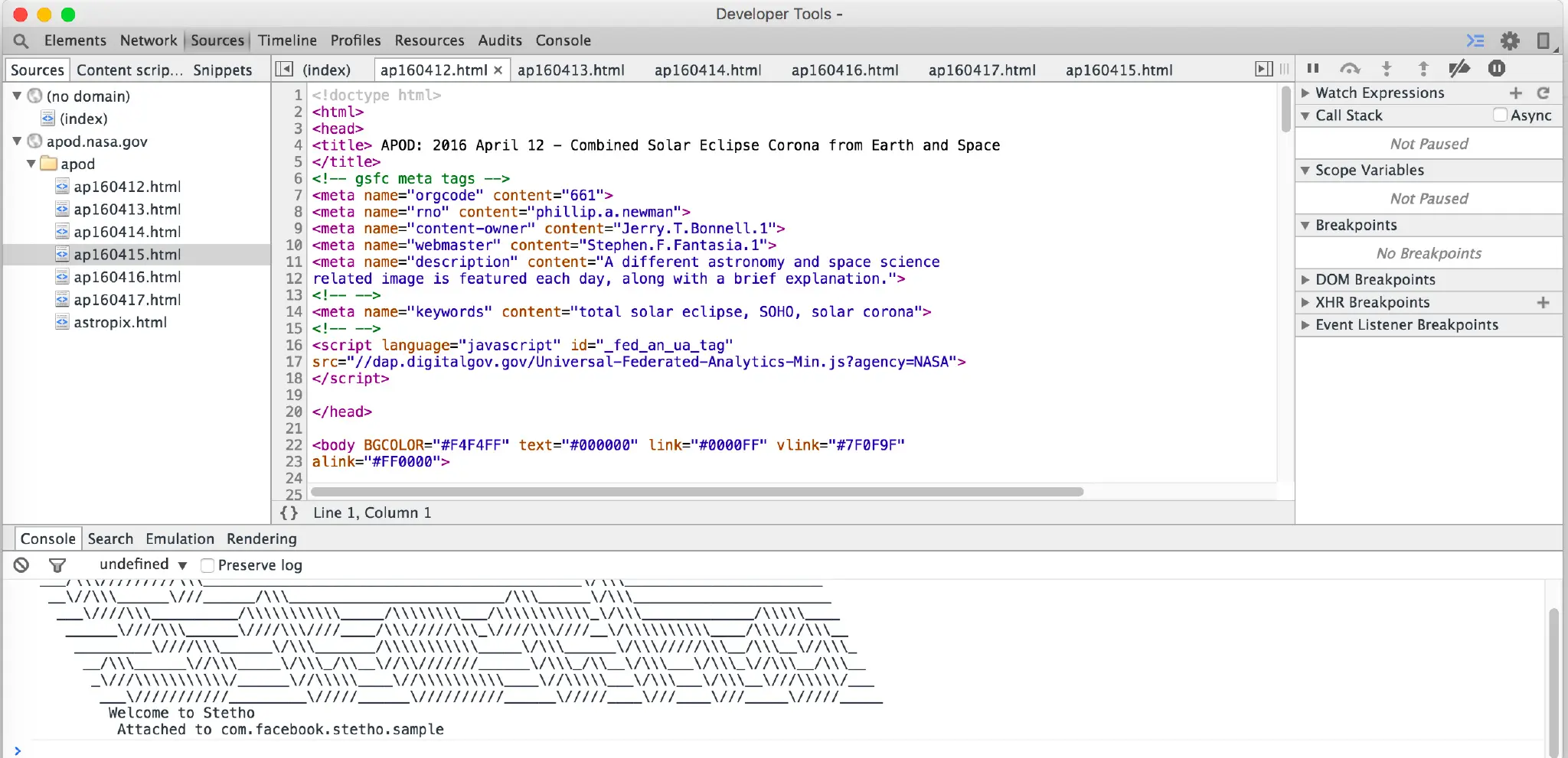 Stetho英译为“听诊”,是Facebook研发的安卓APP网络诊断和数据监控的框架,目前已经开放源代码,开发者接入Stetho框架提供的SDK到APP中,这样就可以通过安装在开发机(PC/MAC,Windows/OS X/Linux)上安装的谷歌的Chrome开发者工具(通过Chrome浏览器使用)来查看,诊断和分析APP中发生的网络请求和响应以及数据内容,就像用Chrome调试网站一样调试APP程序。当然,几乎任何工具都自带老司机console,Stetho也不例外,它提供了一个叫做dumpapp的工具,可以向你倾述更多的APP内心世界。