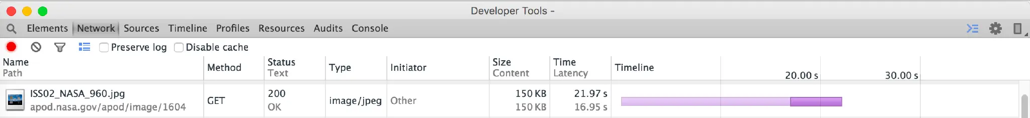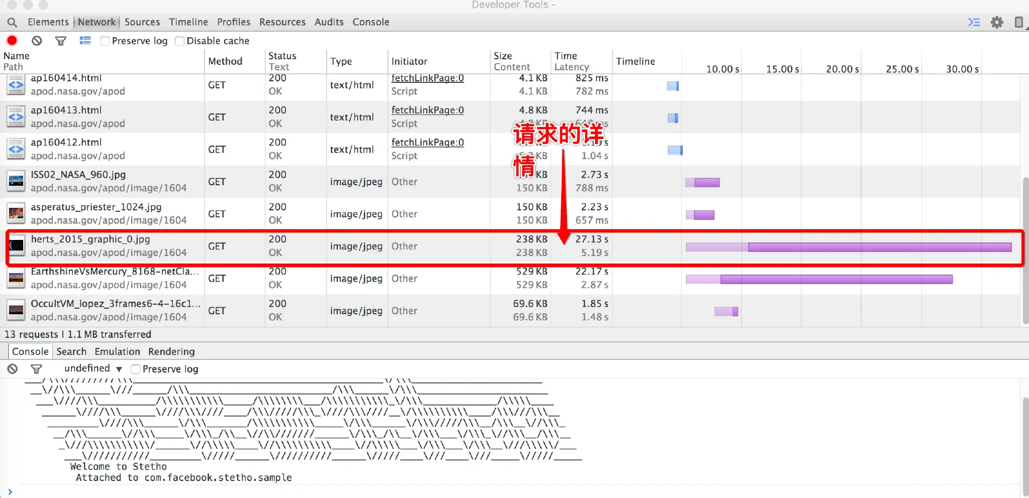 第二个tab叫做"Network",是用来做网络监控的,基本上覆盖了Chrome开发者工具中"Network inspection"的所有功能点,包括下载图片的预览,JSON数据查看,网络请求内容和返回内容