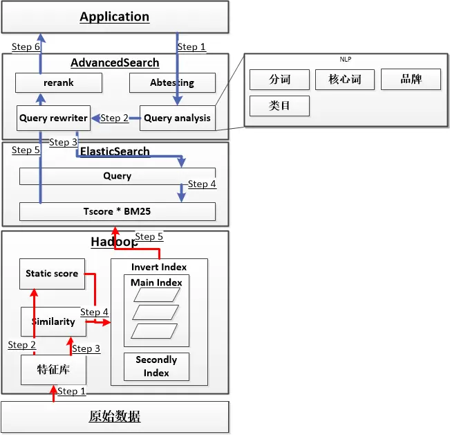 商业电商搜索由于搜索的特殊性, 独立的ElasticSearch集群是无法满足多样的算法需求的, 我们在搜索的各个部件上都有相应的算法插件, 用于构建商业电商搜索引擎的算法体系.