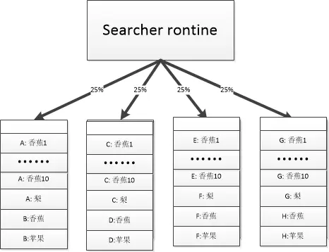 搜索的过程每个桶平均分摊搜索任务的25%, 并根据静态分合并成一页的结果. 这样同一保证结果的相对顺序, 又达到了店铺去重的目的.