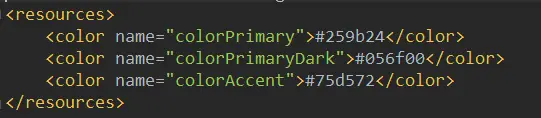 在使用的时候一定要记得要Activity要去继承于SkinBaseActivity,Fragment要继承于SkinBaseFragment,Application要继承于SkinBaseApplication。当然把这个框架做为你的项目依赖项肯定是必不可少的。为了Demo的简单,这里我只使用了下面三个颜色作为可以换肤的资源,当然如果你想要使用drawable文件也是可以办到的,前提是你一定要把这个Demo看懂。