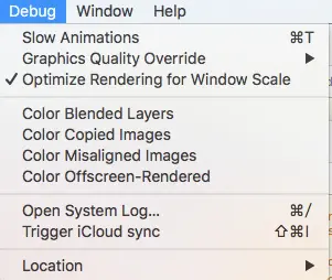 Shows blended view layers. Multiple view layers that are drawn on top of each other with blending enabled are highlighted in red. Reducing the amount of red in your app when this option is selected can dramatically improve your app’s performance. Blended view layers often cause slow table scrolling.
