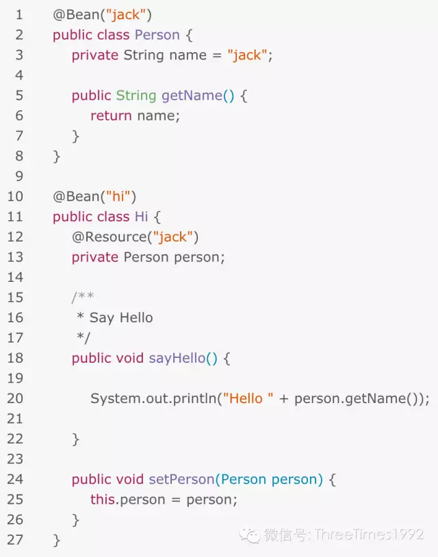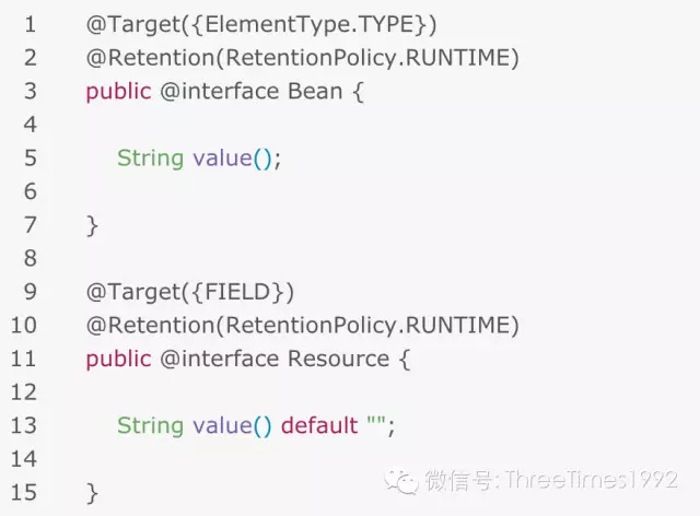 首先,我们定义两个注解@Bean和@Resource,前者用于标注一个对象需要容器管理,后者用于标注所依赖的对象。注解@Bean的值不允许为空,@Resource的值可以为空(则使用字段名称)。至于关于注解的语法,请自行查询相关资料。