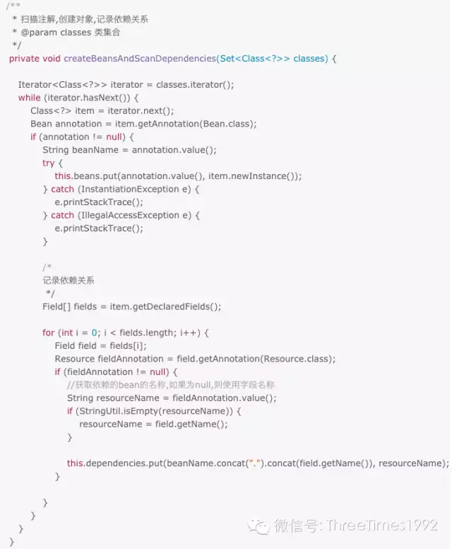 遍历类集合,如果检测到有@Bean注解则实例化对象存放到Map中,然后继续扫描该类下的所有field,如果发现@Resource注解则记录依赖值Map中。