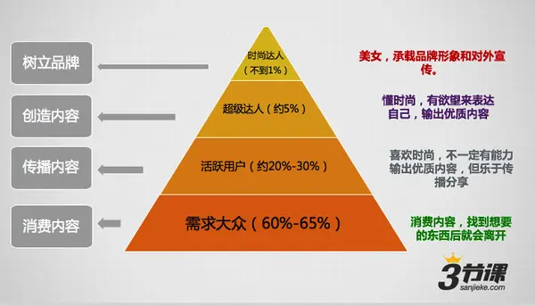 你会发现,在这个生态中,美丽说把自己的用户分成了时尚达人、超级达人、活跃用户和需求大众4类,其中时尚达人承载品牌树立作用,超级达人主要生产和创造内容,活跃用户主要会加速优质内容的传播,而需求大众则主要是消费内容的。