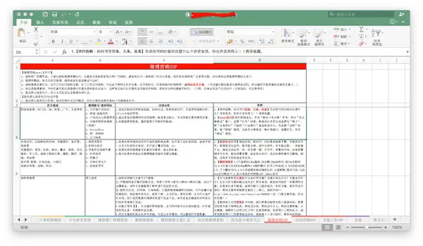 首先,他有一个自己工作的SOP(标准工作步骤),比如在“微博营销SOP”这个表里的内容是这样的: