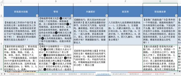 还有这个表:知识类微博素材。他把自己收集到的所有知识类微博素材都放进了这个表里,然后这里就成了他的弹药库。