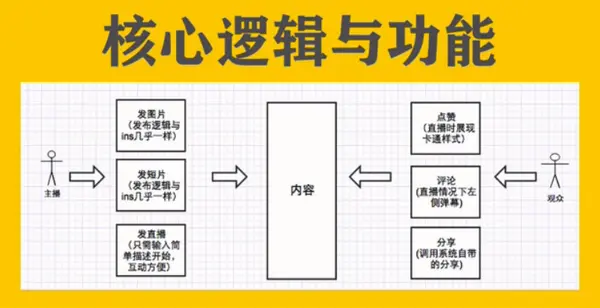 在这张图上,我们可以看到,其实17要搭建的是一个以内容为中心的生态,一方面要找到主播,通过发图片、短片、直播等方式来提供内容,另一方面则是要找到观众,通过观看、点赞、评论、分享等方式来消费内容。