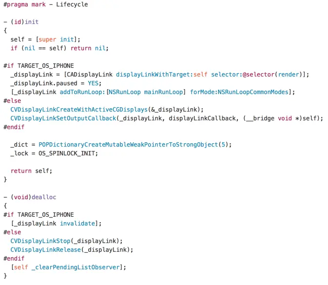 在 POPAnimator.mm 中我们可以发现它使用了 DisplayLink 这种技术,使用它,我们可以轻松地捕捉到每次屏幕刷新,也就是说每次屏幕刷新一下,我们就更新一下被动画对象的状态,实际上就是 Pop 自己用 DisplayLink 实现了一个高精度的 Timer,然后常规地设置属性来达到动画目的。实际上除了系统的 CoreAnimation 以外,绝大多数开源库都用了这个方法。