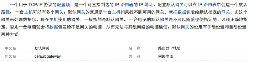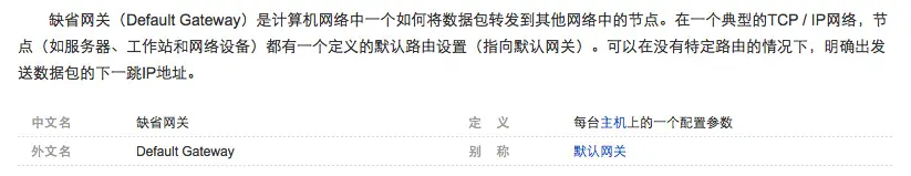 缺省网关(Default Gateway)是计算机网络中一个如何将数据包转发到其他网络中的节点。在一个典型的TCP / IP网络,节点(如服务器、工作站和网络设备)都有一个定义的默认路由设置(指向默认网关)。可以在没有特定路由的情况下,明确出发送数据包的下一跳IP地址。