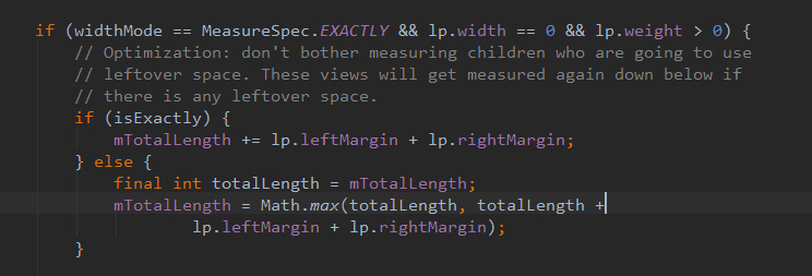 final int widthMode = MeasureSpec.getMode(widthMeasureSpec);//LinearLayout宽度模式