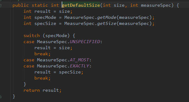 1 可以看到view中的onMesure在两种MeasureSpec分别为At_MOST(对应LayoutParams中的wrapcontent)和EXACTLY(对应layoutparams中的matchparent或者fillparent)的情况下是一样的在getDefaultSize 方法中返回了result=specSize,也就是说直接继承View的自定义控件无论他的子view,wrapcontent,还是matchparent返回的测量尺寸大小都是一样的。显然这是不符合逻辑的,所以子view必须要做出自己的onMeasure操作。