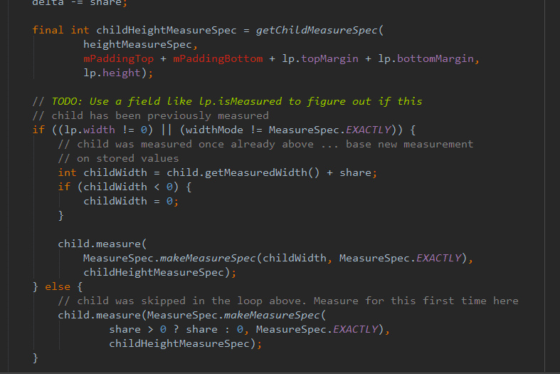 如果MesureSpec的宽度模式是UNSPECIFIED或者AT_MOST,也就是说子元素想自定义宽,但是lp .width是0,但是子元素weight不为零,所以说,这时候还不能确定它的宽度,但是不能把它宽度置为0.这也就是我们遇见的,如果利用了weight属性,会导致linearLayout测量两次。