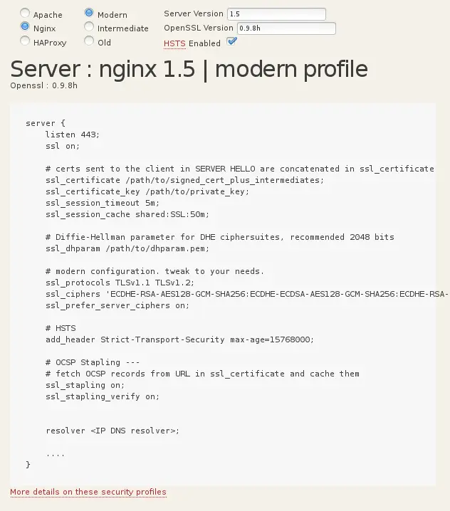 ssl-default-server-ciphers ECDHE-ECDSA-CHACHA20-POLY1305:ECDHE-RSA-CHACHA20-POLY1305:ECDHE-ECDSA-AES128-GCM-SHA256:ECDHE-RSA-AES128-GCM-SHA256:ECDHE-ECDSA-AES256-GCM-SHA384:ECDHE-RSA-AES256-GCM-SHA384:DHE-RSA-AES128-GCM-SHA256:DHE-RSA-AES256-GCM-SHA384:ECDHE-ECDSA-AES128-SHA256:ECDHE-RSA-AES128-SHA256:ECDHE-ECDSA-AES128-SHA:ECDHE-RSA-AES256-SHA384:ECDHE-RSA-AES128-SHA:ECDHE-ECDSA-AES256-SHA384:ECDHE-ECDSA-AES256-SHA:ECDHE-RSA-AES256-SHA:DHE-RSA-AES128-SHA256:DHE-RSA-AES128-SHA:DHE-RSA-AES256-SHA256:DHE-RSA-AES256-SHA:ECDHE-ECDSA-DES-CBC3-SHA:ECDHE-RSA-DES-CBC3-SHA:EDH-RSA-DES-CBC3-SHA:AES128-GCM-SHA256:AES256-GCM-SHA384:AES128-SHA256:AES256-SHA256:AES128-SHA:AES256-SHA:DES-CBC3-SHA:!DSS
