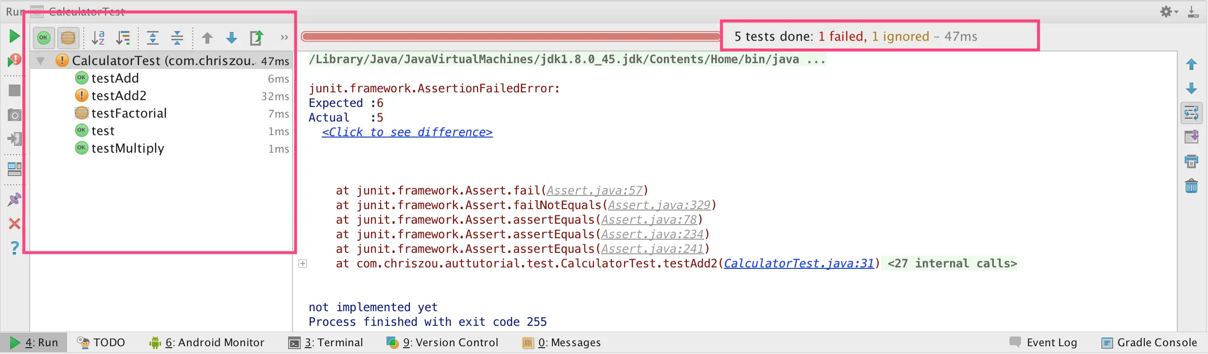 比较有意思的是最后一个方法,fail(),你或许会好奇,这个有什么用呢?其实这个在很多情况下还是有用的,比如最明显的一个作用就是,你可以验证你的测试代码真的是跑了的。