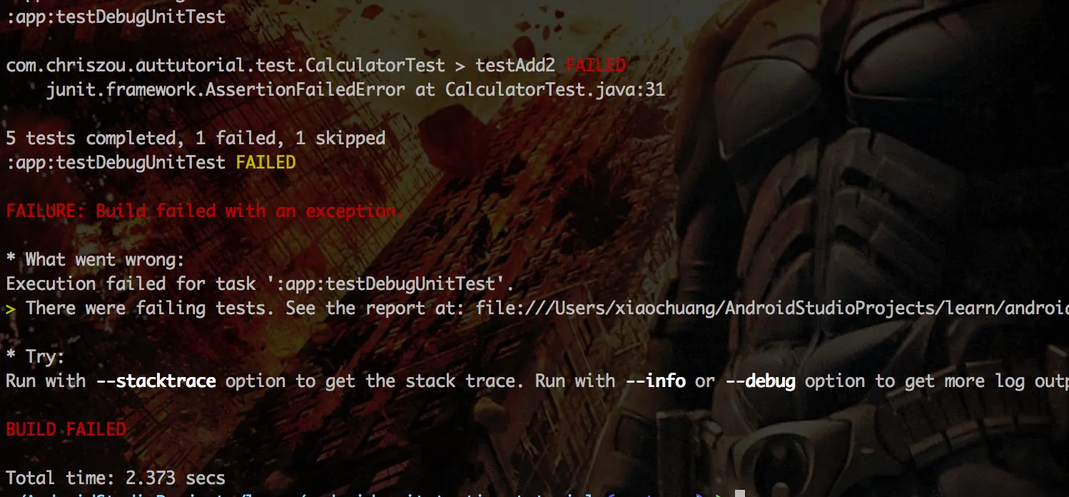 这里让大家看一下运行的结果是什么样子的,其中有一个失败的测试用例是故意的。如果你直接在AndroidStudio里面跑上面的测试类CalculatorTest的所有测试方法的话,会看到如下的结果: