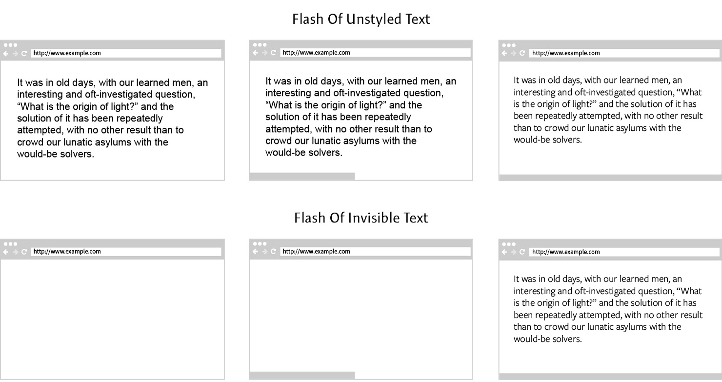 }Loading web fonts this way might remind you of progressive enhancement. This is not a coincidence. The Flash Of Unstyled Text is progressive enhancement. The default experience is rendered using fallback fonts, and then enhanced with web fonts.