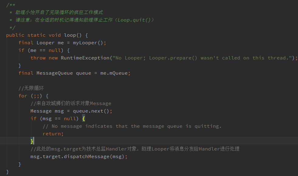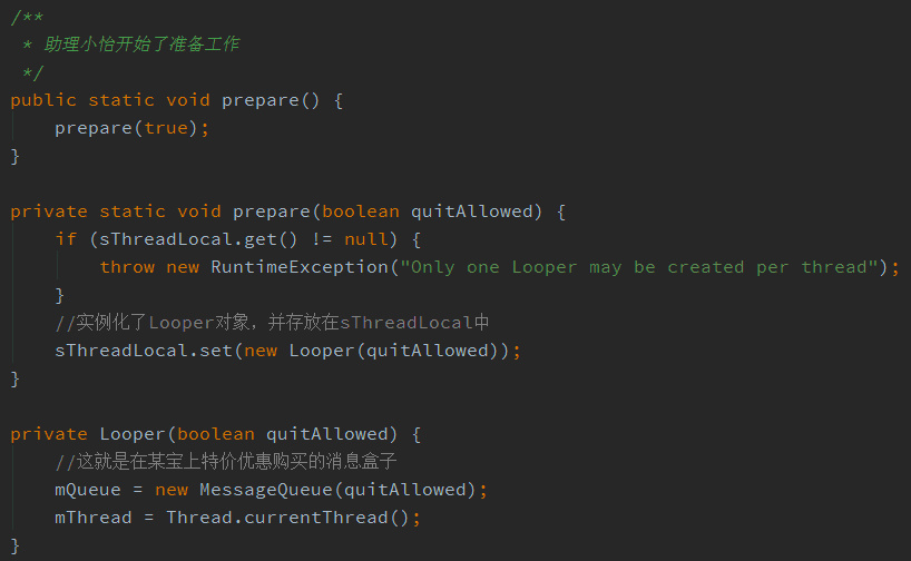 助理小怡的工作内容主要有两件事情,第一件事情是做好准备工作(Looper.prepare()),即到某宝上包邮购买了一个消息盒子(MessageQueue),用来收集攻城狮们(Thread)的各种诉求(Message)。第二件事情是开启无限循环的工作模式(Looper.loop()),她无比勤劳的等待着攻城狮们的各种召唤,收集他们的诉求,并传达给技术总监。让我们来看下她是怎么做到的: