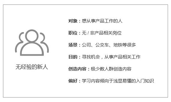 第一类用户群:想从事产品方面的工作,实习或刚毕业的大学生,从其他岗位转到产品相关岗位的人。这类人群,逛社区的频次很高,哪里有好的内容就去哪里,主要是阅读类用户,不太自己创造内容,对社区没有形成强烈的忠诚度。