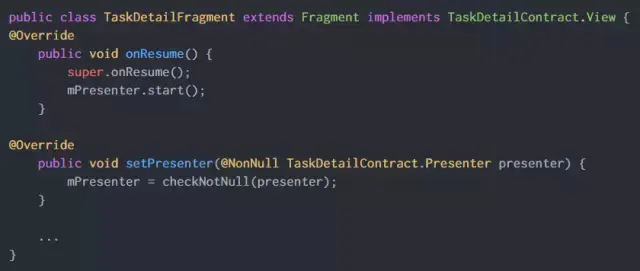 我们可以从上面看到整个创建过程,而且要注意的是创建后的fragment实例作为presenter的构造函数参数被传入,这样就可以在presenter中调用view中的方法了。