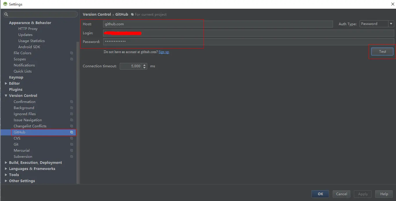 - 关联自己的Github账号:Settring -> VersionControl ->GitHub,设置自己的github账号,密码,点击Test测试,如果成功会有Success提示