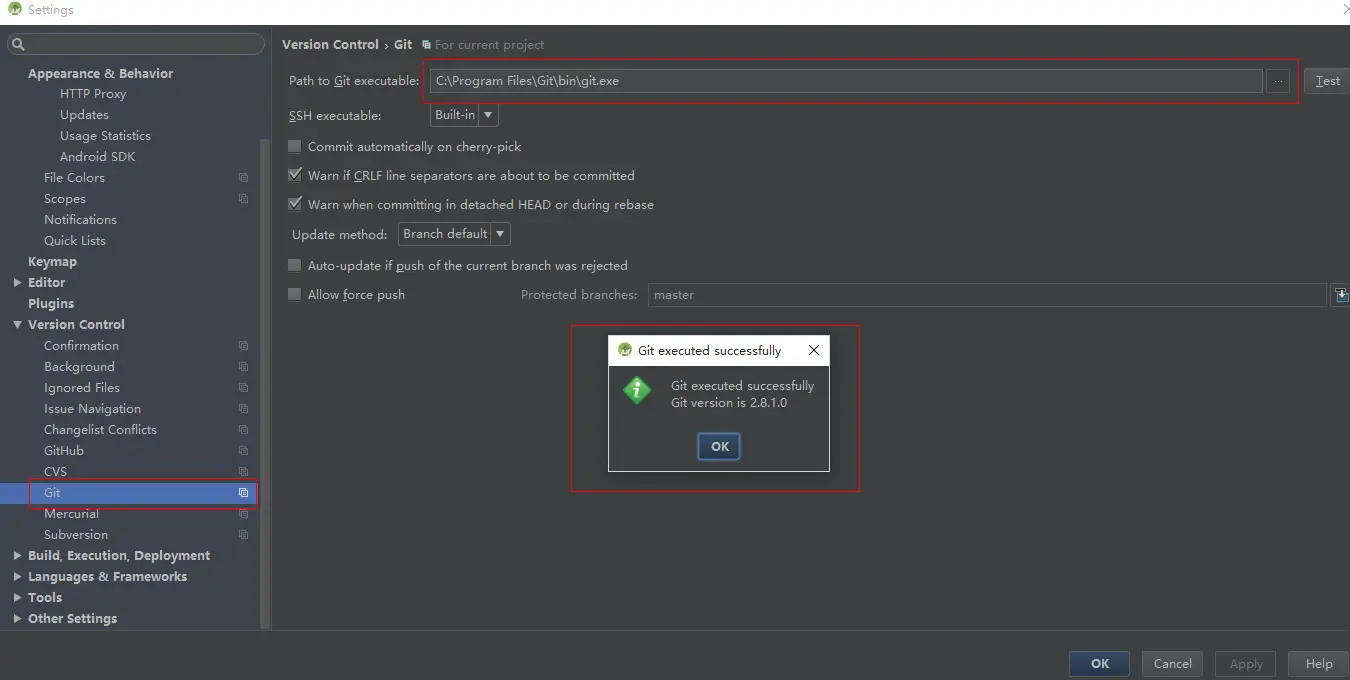 - 配置Git:Settings -> Version Control -> Git ,设置git目录,点击Test测试,如果成功会有Success提示