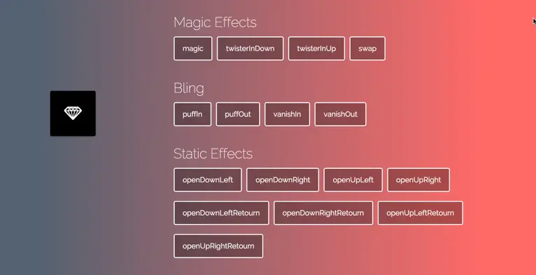 Magic Animations与Animate.css十分类似,也是一个预定义了一系列动效的CSS库。但与Animate.css的最大区别可能是,它定义的那些动效更炫也更酷一些,如果你的网站也很新潮,那可以考虑使用这个CSS动效库。