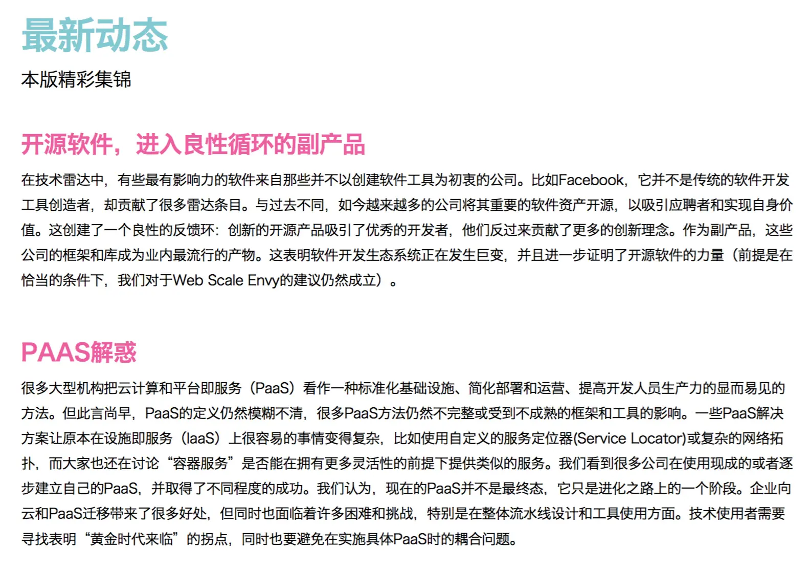 ThoughtWorks在每年都会出品两期技术雷达,这是一份关于技术趋势的报告,它比起一些我们能在市面上见到的其他各种技术行情和预测报告,更加具体,更具可操作性,因为它不仅涉及到新技术大趋势,比如云平台和大数据,更有细致到类库和工具的推介和评论,从而更容易落地。