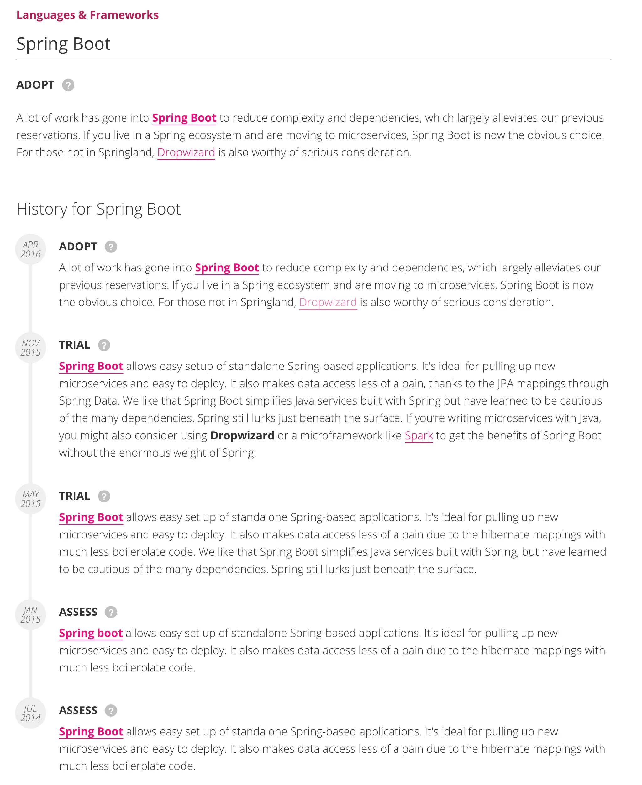 另外更加明显的在技术雷达上不断演进的例子是Gradle和SpringBoot。比如下面是技术雷达的历次版本对于SpringBoot的推介态度: