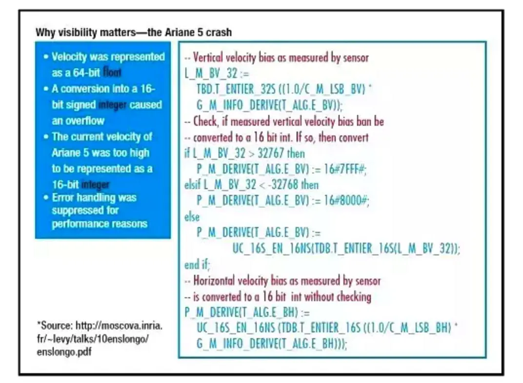 摘自Ariane 5的代码片段。因为对整型数溢出的保护不足导致了Ariane5在其1996年首飞时坠毁。