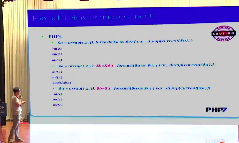 那么开始上图,这是鸟哥(惠新宸,PHP7核心开发组成员,开发组中唯一的一个中国人[撒花])在Think 2015 PHP技术峰会上的一个演讲截图,他在讲述PHP5的foreach和PHP7的foreach区别,我们把他演讲中提及到PHP5的部分拿出来看看。