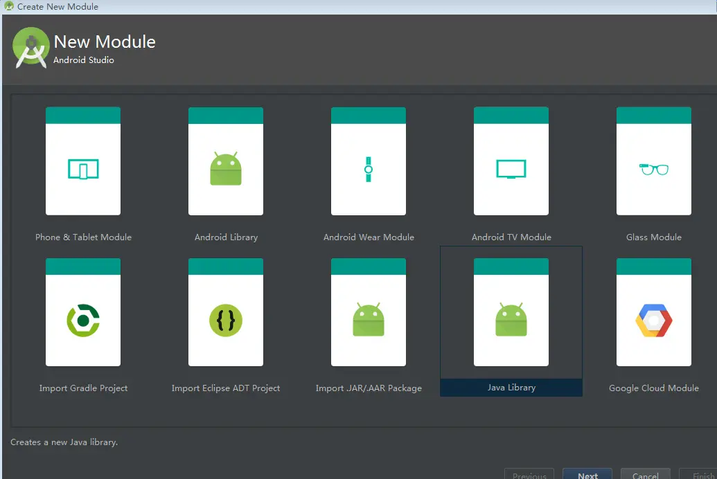 1.通过 File -> New -> New Module -> Java Library -> 填写相应的包名与类名 -> Finish.