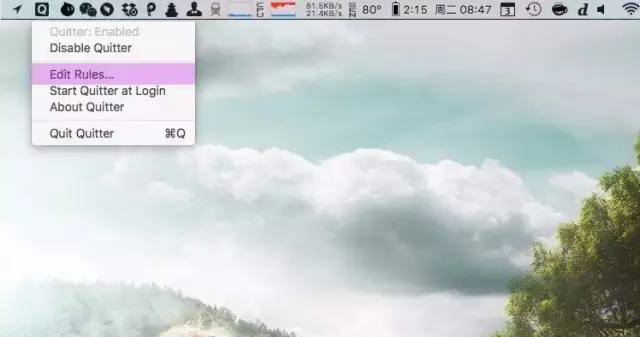 激活 Quitter 后会在顶部菜单栏常驻一个 icon,可以通过它激活或休眠应用。使用之前我们需要先配置一些规则,点击「Edit Rules」进入配置页面。