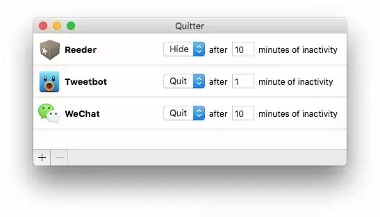 我大致回忆了一下,微信、Tweetbot 和 Reeder 这三个是最容易导致我工作时分心的三个应用。所以我决定将它们三个交给 Quitter 进行监管,经过一天的测试还是能起到一定的作用的。看不到它们自然被打扰的几率也就变小了。