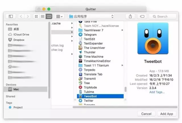 在打开的选择面板中使用快捷键「Cmd+Shift+A」进入应用文件夹,选择需要被 Quitter 接管控制的应用。比如我在这里将 Tweetbot 添加到规则列表中,希望它帮助我控制上班时间不刷 Twitter。