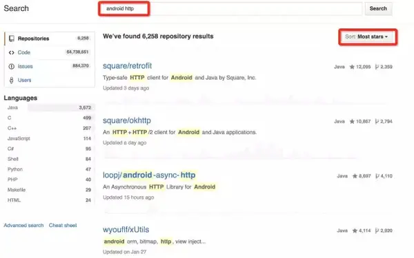 下面以一个例子来更详细具体的说明。假设我们现在急需一个http网络请求库在项目中使用,是我的话,那我肯定在 GitHub 上搜索「android + http」作为关键字。