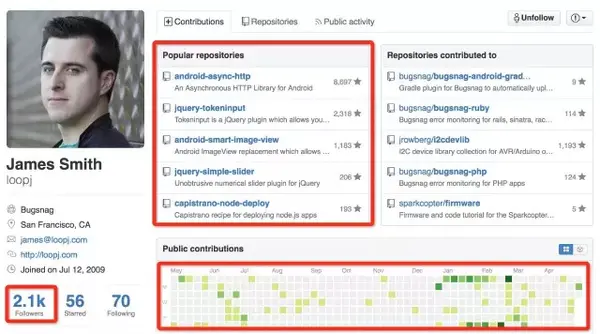 作者 loopj 的followers有2k多,而且自己的好几个开源项目Star都蛮多的,这一年的GitHub提交不算特别活跃,但是还行,总体来说是影响力蛮大的一位开源作者。