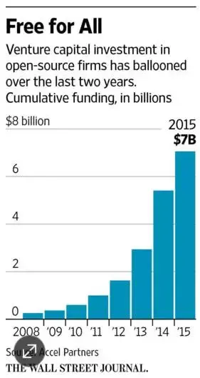 上图是目前三者的一个搜索趋势对比(来自Google)。开源更多的是独立开发者们共同合作的成果。其产品具有独特的竞争优势,比如低风险、低付出、产品质量更可靠、行业适应能力更强、产品更透明。开源几乎成为每个科技公司基础设施建设的关键所在。因此,很多开源项目成为了这个市场上的赢家,从下面的统计图表中我们不难发现,风险投资商向开源投入巨资,并且在近两年呈膨胀趋势,来探索新的商业模式。但直到今天,也只有很少的几家公司能够赚到钱。结果,与其他商业模式相比,很少有大的业务构建在开源之上。