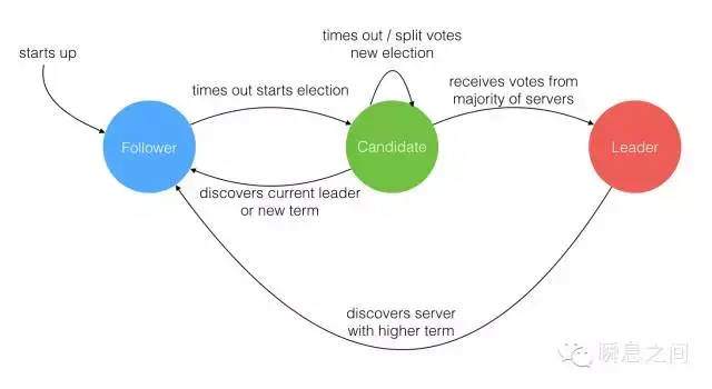 就像一个民主社会,领袖由民众投票选出。刚开始没有领袖,所有集群中的参与者都是群众,那么首先开启一轮大选,在大选期间所有群众都能参与竞选,这时所有群众的角色就变成了候选人,民主投票选出领袖后就开始了这届领袖的任期,然后选举结束,所有除领袖的候选人又变回群众角色服从领袖领导。这里提到一个概念「任期」,用术语 Term 表达。关于 Raft 协议的核心概念和术语就这么多而且和现实民主制度非常匹配,所以很容易理解。三类角色的变迁图如下,结合后面的选举过程来看很容易理解。