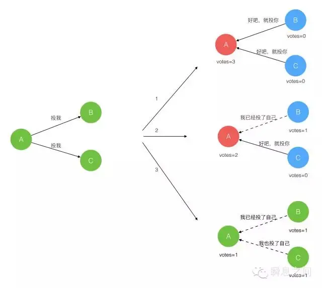 在极简的思维下,一个最小的 Raft 民主集群需要三个参与者(如下图:A、B、C),这样才可能投出多数票。初始状态 ABC 都是 Follower,然后发起选举这时有三种可能情形发生。下图中前二种都能选出 Leader,第三种则表明本轮投票无效(Split Votes),每方都投给了自己,结果没有任何一方获得多数票。之后每个参与方随机休息一阵(Election Timeout)重新发起投票直到一方获得多数票。这里的关键就是随机 timeout,最先从 timeout 中恢复发起投票的一方向还在 timeout 中的另外两方请求投票,这时它们就只能投给对方了,很快达成一致。