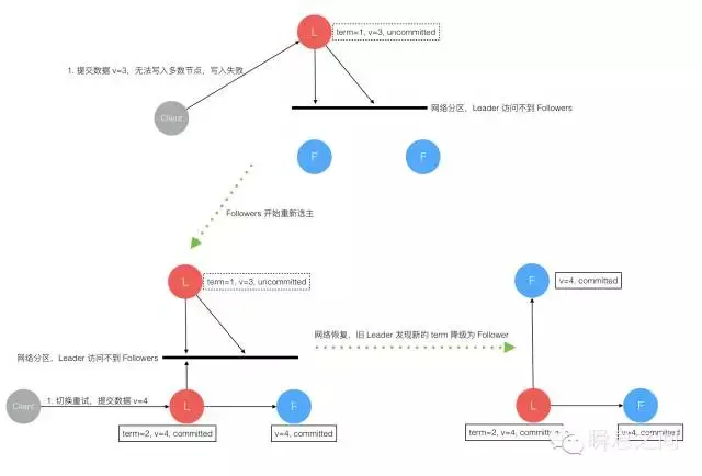 网络分区将原先的 Leader 节点和 Follower 节点分隔开,Follower 收不到 Leader 的心跳将发起选举产生新的 Leader。这时就产生了双 Leader,原先的 Leader 独自在一个区,向它提交数据不可能复制到多数节点所以永远提交不成功。向新的 Leader 提交数据可以提交成功,网络恢复后旧的 Leader 发现集群中有更新任期(Term)的新 Leader 则自动降级为 Follower 并从新 Leader 处同步数据达成集群数据一致。