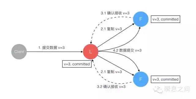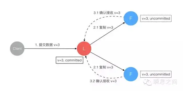 5. 数据到达 Leader 节点,成功复制到 Follower 所有或多数节点,数据在 Leader 处于已提交状态,但在 Follower 处于未提交状态