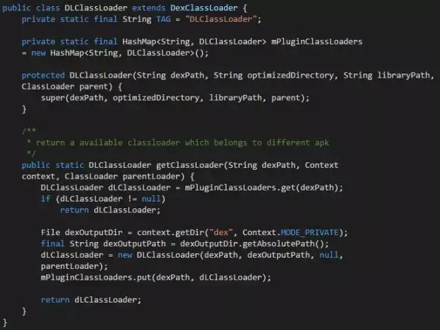 为了更好地对多插件进行支持,需要合理地去管理各个插件的DexClassLoader,这样同一个插件就可以采用同一个ClassLoader去 加载类,从而避免了多个ClassLoader加载同一个类时所引发的类型转换错误。在下面的代码中,通过将不同插件的ClassLoader存储在一个 HashMap中,这样就可以保证不同插件中的类彼此互不干扰。