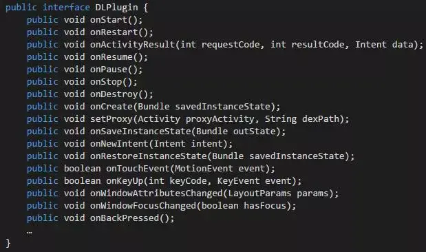 使用反射来管理插件Activity的生命周期是有缺点的,一方面是反射代码写起来比较复杂,另一方面是过多使用反射会有一定的性能开销。下面介绍 接口方式,接口方式很好地解决了反射方式的不足之处,这种方式将Activity的生命周期方法提取出来作为一个接口(比如叫DLPlugin),然后通 过代理Activity去调用插件Activity的生命周期方法,这样就完成了插件Activity的生命周期管理,并且没有采用反射,这就解决了性能 问题。同时接口的声明也比较简单,下面是DLPlugin的声明: