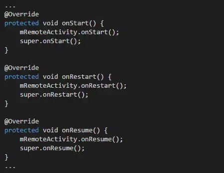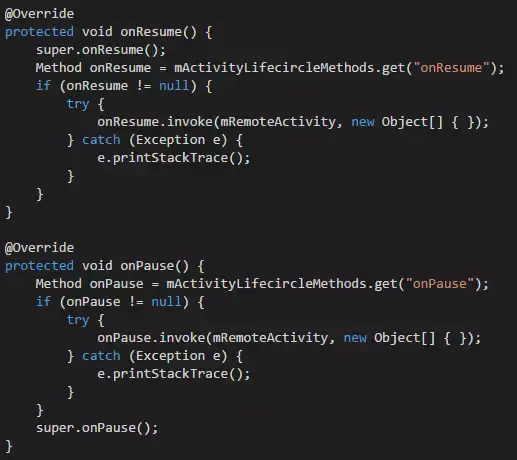 管理Activity生命周期的方式各种各样,这里只介绍两种:反射方式和接口方式。反射的方式很好理解,首先通过Java的反射去获取 Activity的各种生命周期方法,比如onCreate、onStart、onResume等,然后在代理Activity中去调用插件 Activity对应的生命周期方法即可,如下所示。
