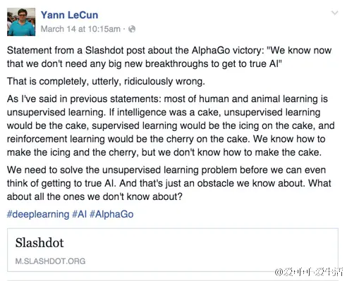 最近人工智能随着AlphaGo战胜李世乭这一事件的高关注度,重新掀起了一波新的关注高潮,有的说人工智能将会如何超越人类,有的说将会威胁到人类的生存和发展,种种声音都在表明人工智能的又一个春天即将到来,但很多学者认为媒体的过度炒作,会引发民众对人工智能不切实际地期待,从而导致人工智能寒冬的又一次到来。Yann Lecun作为上一个人工智能寒冬时期还在坚持做冷门的神经网络研究的人,他对AI有一个非常理性的认知。