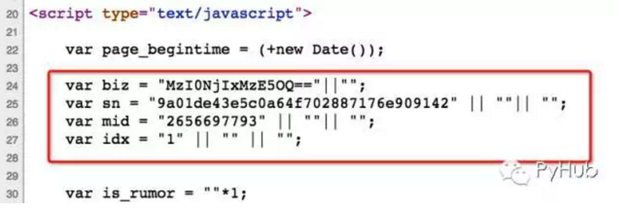 微信公众号的文章链接有些是具有时效性的,过一段时间会变成参数错误而无法访问,但是我们发现从公众号后台点击过去得到的链接却是永久链接,其参数不会改变链接也不会失效,也就是说只要能够获得这些参数就可以得到永久链接。通过观察发现即使从搜狗搜索入口的有时效性的链接访问网页,其源码中也带有这些参数: